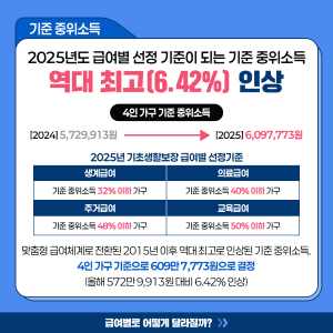 2025년도 기준 중위소득이 6.42% 인상되어 역대 최고 인상률을 기록했습니다.