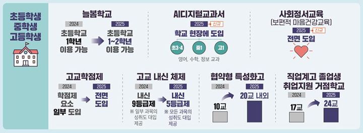 3. 저소득층 학생 지원: 교육급여 인상, 꿈사다리 장학금 확대 등을 통해 경제적 부담을 완화합니다.